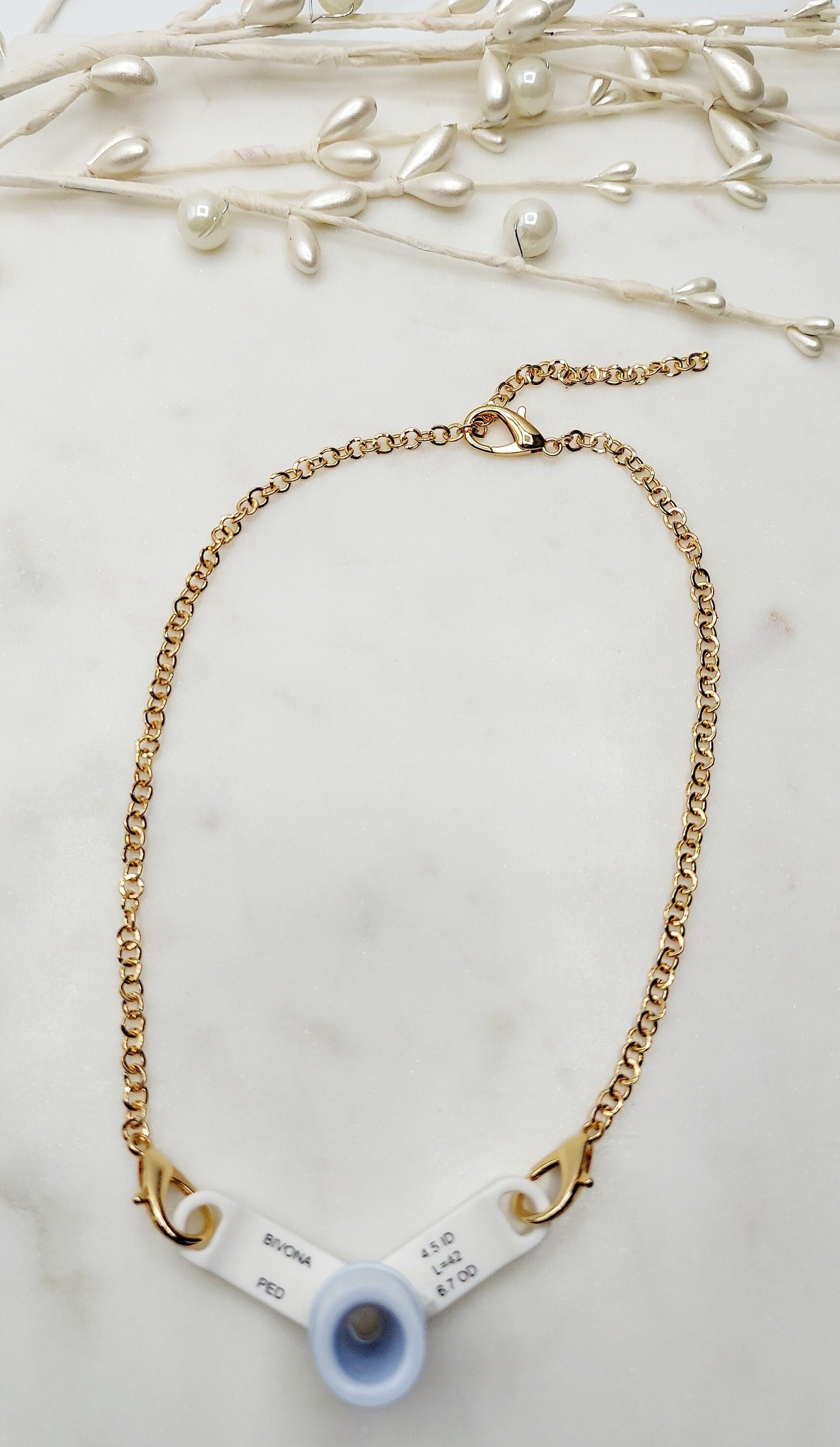 This beaded trach tie is used to hold a trach in place. This tie is a fashionable, elegant, and individually custom handcrafted accessory. Better still, it helps to limit neck irritation while still holding the tube in place.