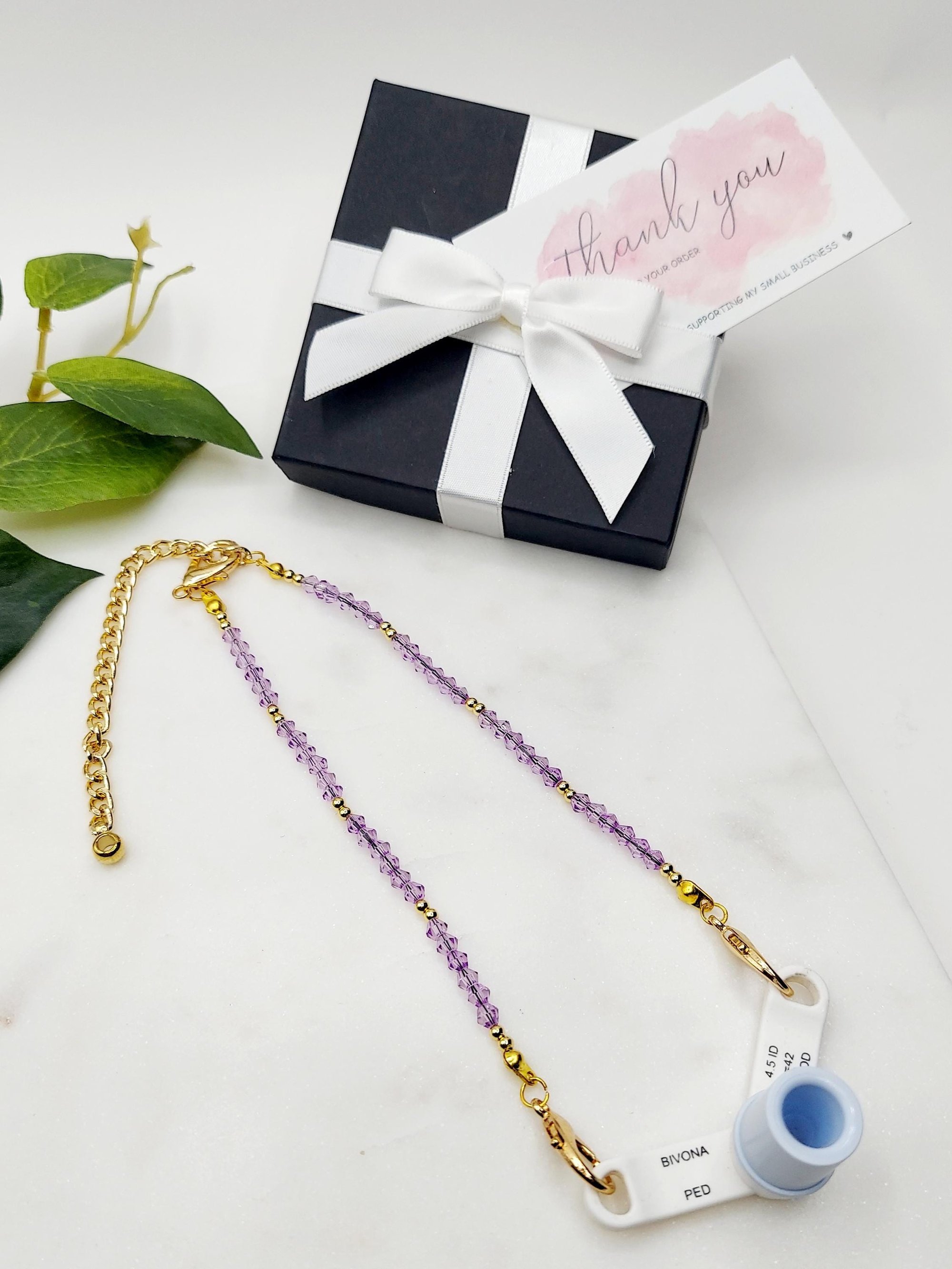 Original product name: Trach Ties, Beaded Trach Ties , Adjustable, Trach Chain, Beaded, Trach Collar Tube Holder (Lavender with Gold Accents)